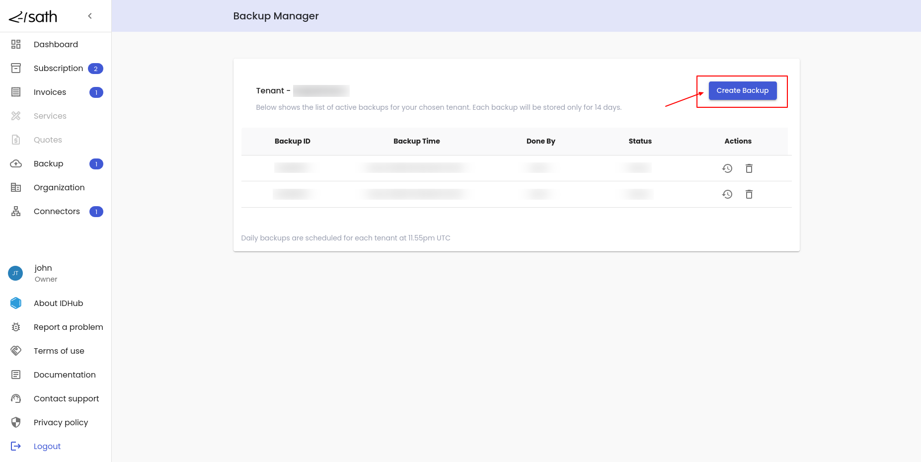 Create Backupbutton in order to create the backup for the tenant. A toast message will appear thatBackup Created Successfully. - IDHub creates the backup of the tenant and once the backup is completed, it will be added to the list of backups.