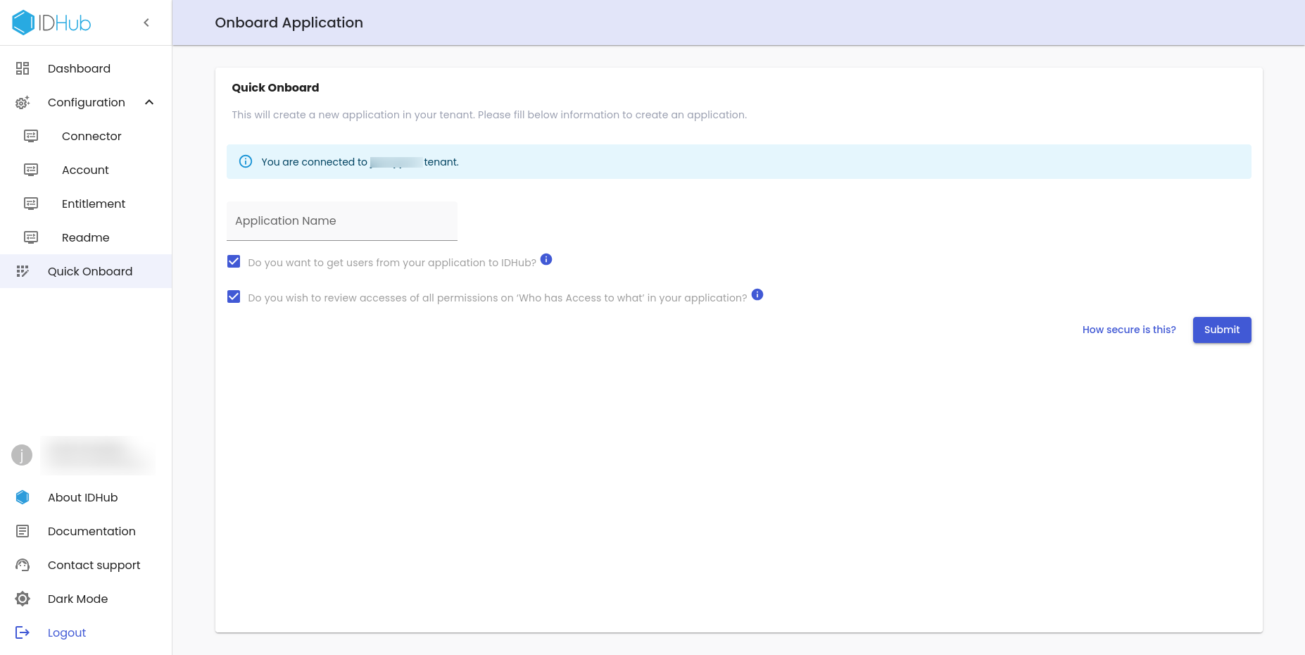 • Enter the application URL and the tenant name. The application URL is the IDHub application URL for example: https://app.sath.com