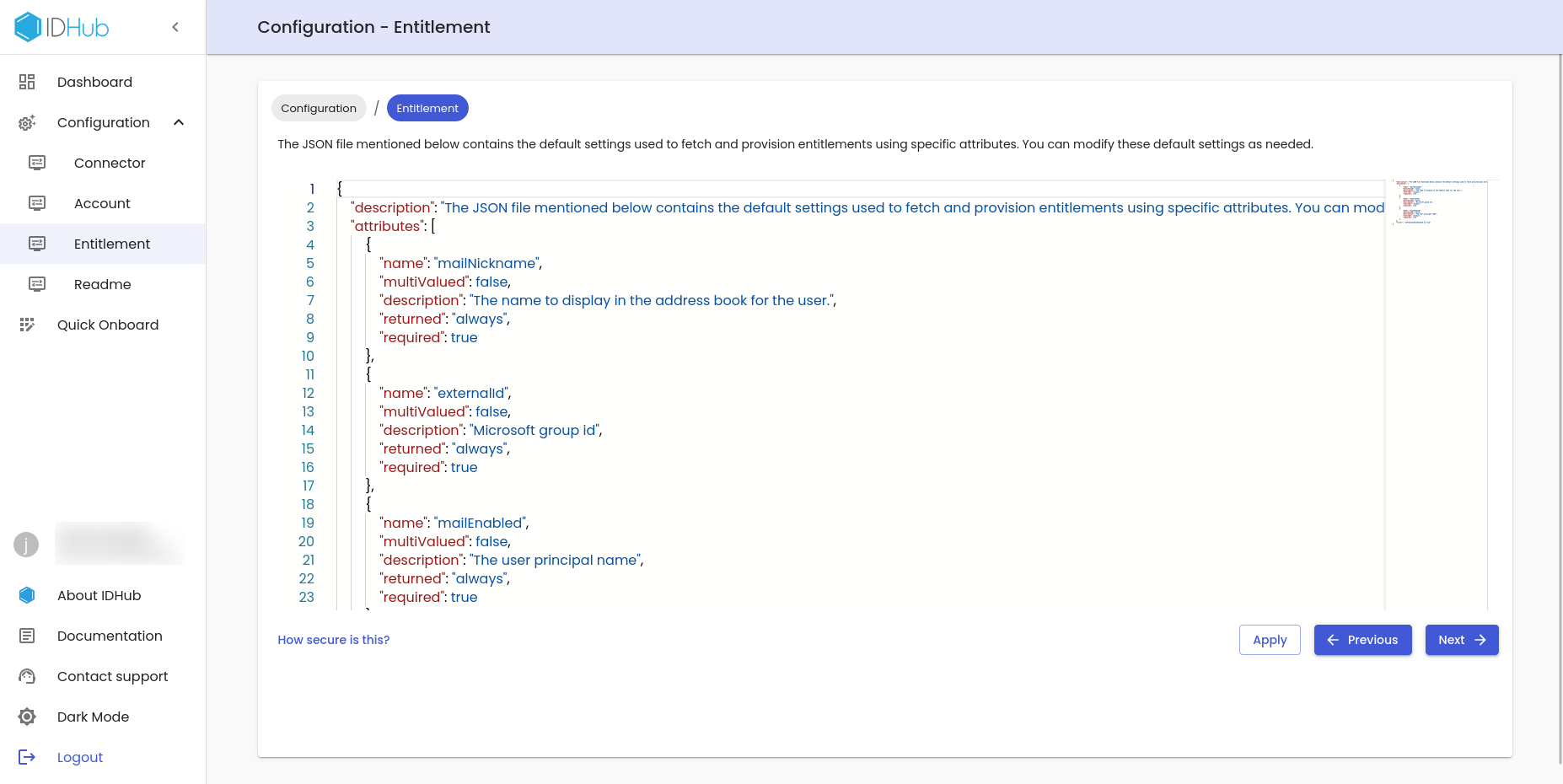 Click on the Apply and Next button to proceed further to the Entitlement JSON editor page.