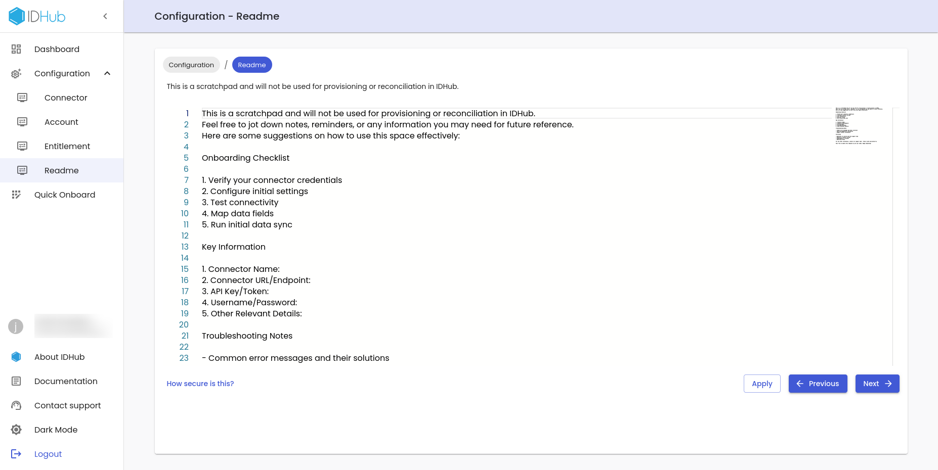 This page functions as the scratch pad for the connector configuration. Here you can enter any notes, reminders, or any information you may need for future reference for the connector configuration.