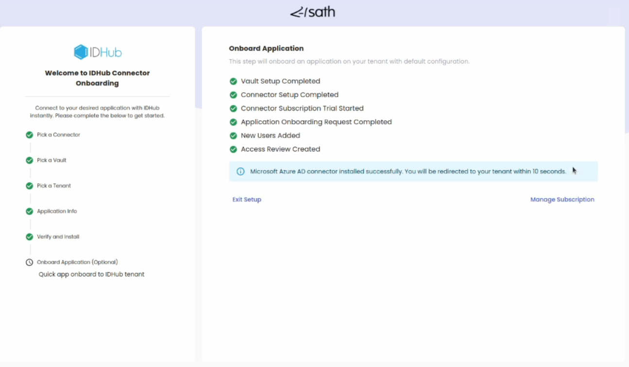 Setup will take some time and display the confirmation message. At this stage, Entra ID is successfully installed and optionally your Entra ID application is also onboarded to IDHub.