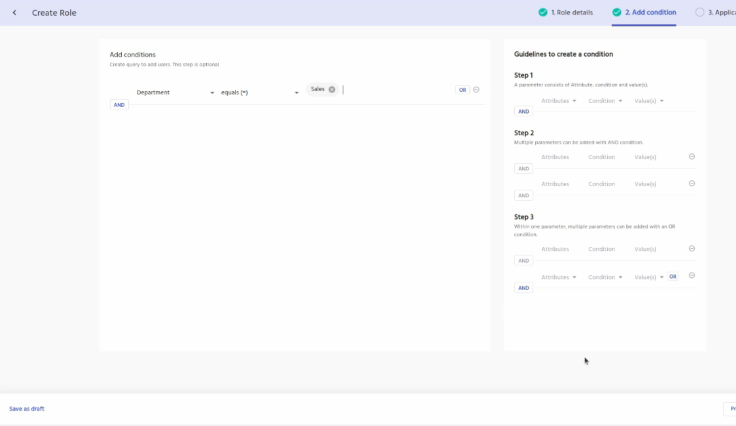 In the first screen enter the required basic details of the role and then click on the next button. In the next screen add a condition, that department is sales as shown below.