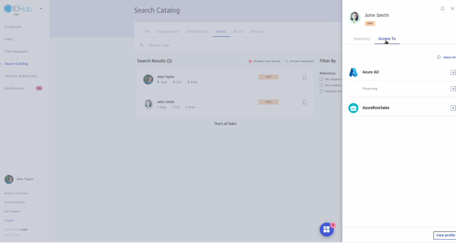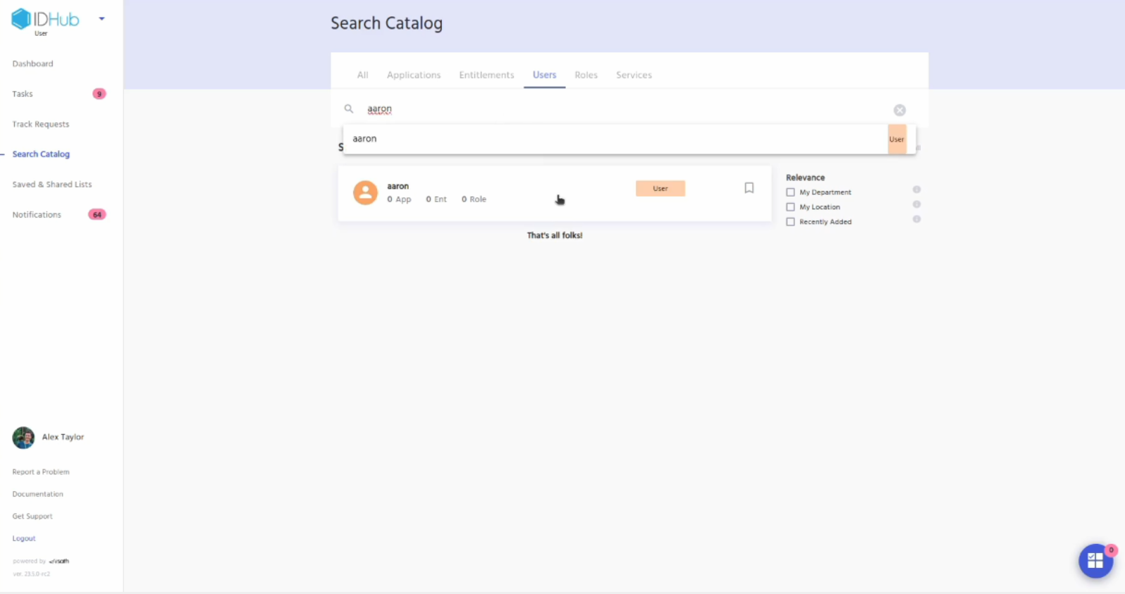 Go to IDHub user app, click on the search catalog and then click on the users tab. Search for the user whom you have just revoked access via certification.