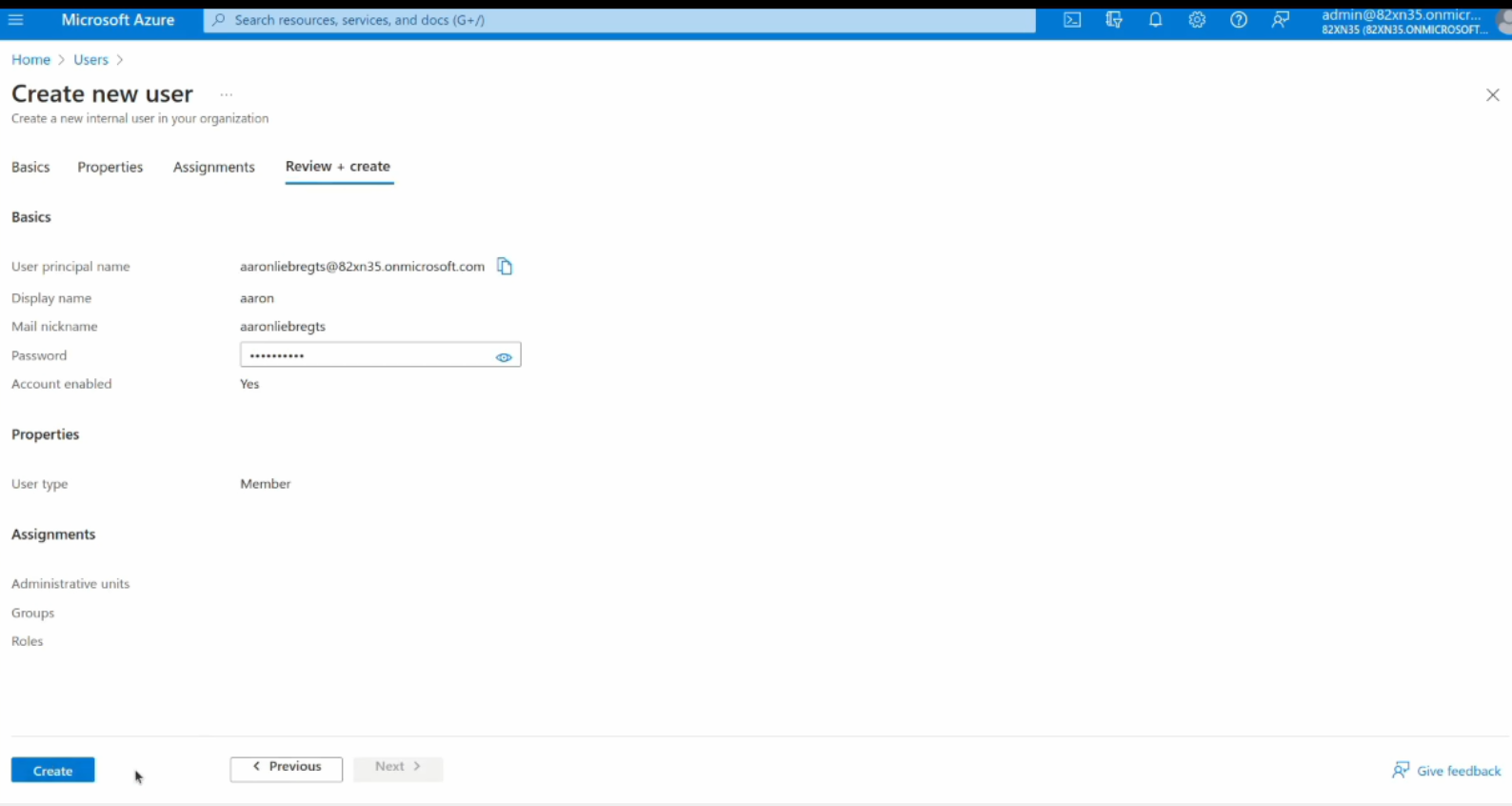 Another screen will display the confirmation page and you need to click on the create button to add the new user to your Entra ID instance.