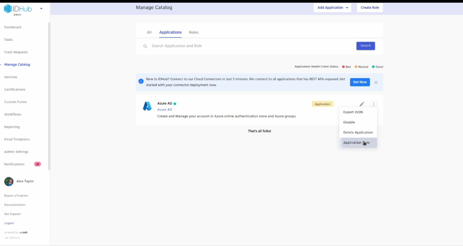 Now goto manage catalog, click on the 3 dots menu for the Entra ID application, click on the Application Sync menu