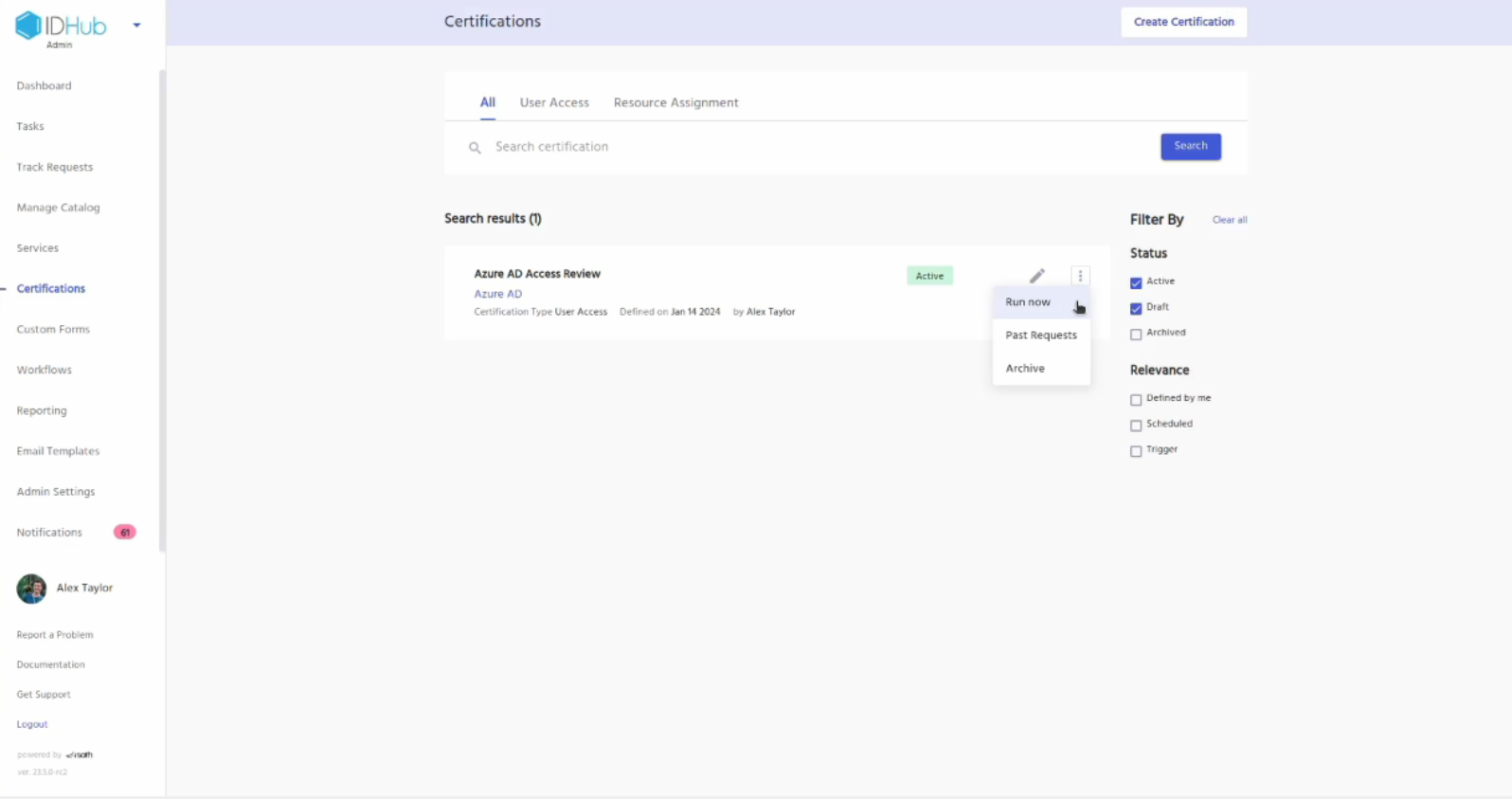 Now goto certifications and click on the 3 dots menu for the Entra ID Access Review certification and then click on the run now.