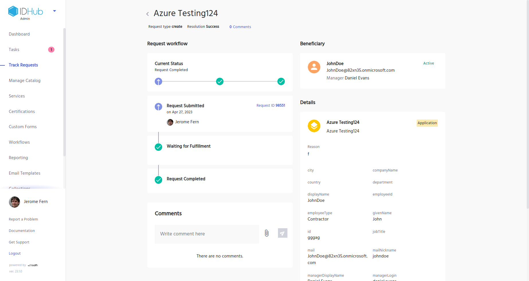 The request is for the Entra ID Application, the request has been submitted for a user and IDHub has done the automated provisioning for the user.