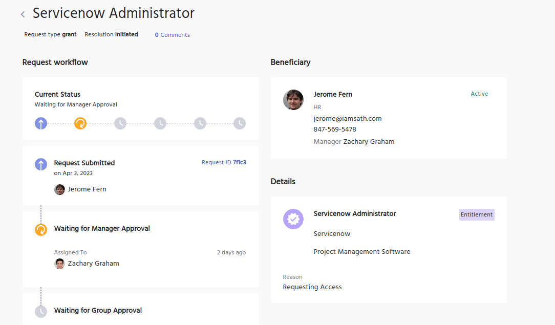This page will give you the complete information and details of the request like beneficiary details, Current Status, Item details, and Request workflow details. This information about the requests will be helpful if you want to talk to the assignee of the request in the current workflow.
