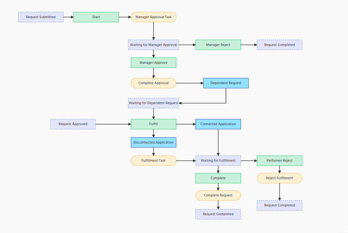 - Now the request is waiting for the Manager to take action on the task generated. Waiting For approval state node is put here to denote the state of the request.